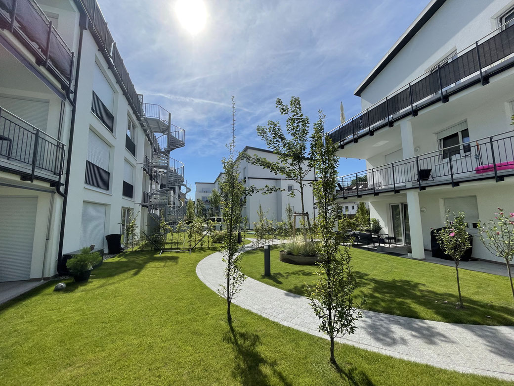 Aktuell entstehen im letzten Abschnitt die drei abschließenden 6-Familienhäuser mit Tiefgarage. Die Mietvermarktung der letzten verfügbaren Wohnungen sind zum September 2025 geplant.